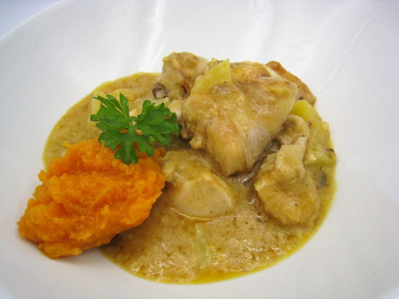 Cuando la carne se haya dorado, añadiremos a la cacerola el agua necesaria para cubrir las porciones de pollo y verteremos encima la mezcla de la marinada que habíamos reservado. Remover bien y dejar cocinar unos 15-20 minutos a fuego medio-alto hasta que la carne esté bien cocinada y la salsa haya espesado.