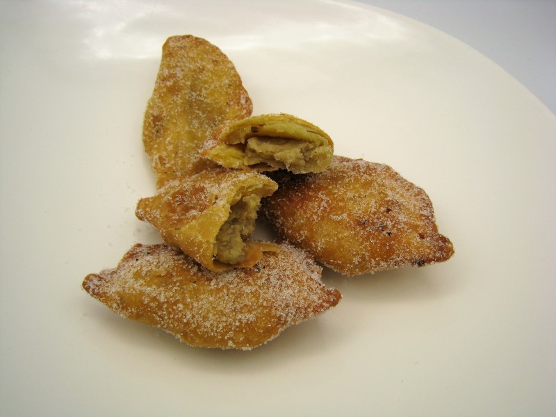 Hacer entonces pequeñas bolitas con la masa de borrachuelos reposada, estirar con un rodillo, disponer un poco de crema dulce de castañas en su interior y cerrar como una empanadilla; sellando los bordes con las púas de un tenedor.