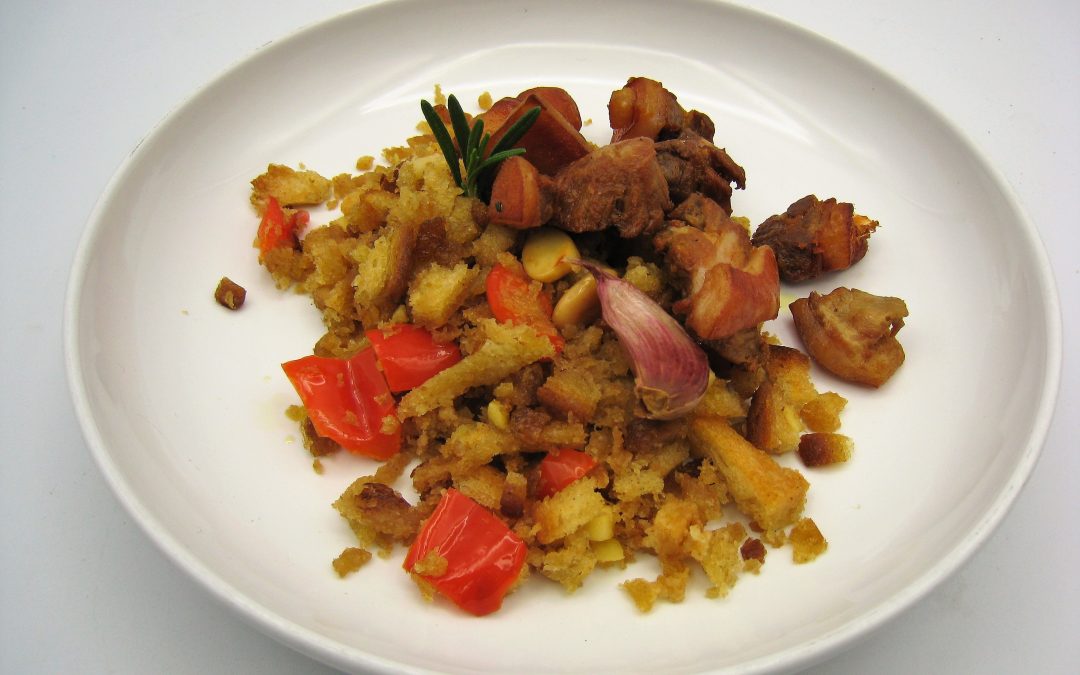 Antes de que las migas se queden muy secas, agregar 1 manzana pelada y cortada en dados pequeños. Cocinar brevemente y devolver los ajos, los pimientos y las almendras. Mezclar y reservar.