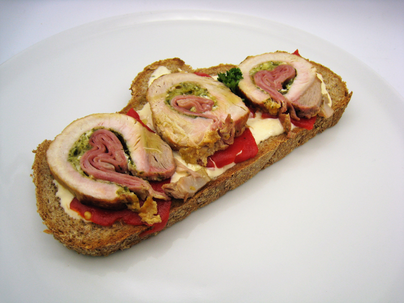 Por otro lado, disponer en una jarra 1 diente de ajo, un buen manojo de hojas de perejil y un poco de virgen extra. Triturar, verter en un cuenco y agregar queso rallado. Mezclar y extender por encima de la carne. Colocar lonchas de jamón cocido y enrollar, apretando para que quede bien compacta. Atar bien con bramante o hilo de cocina para evitar que pierda la forma.