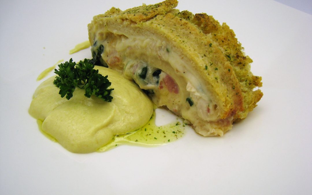 Presentar una rodaja de nuestro rulo crujiente acompañado de salsa de miel y mostaza.