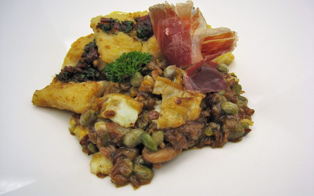 SUGERENCIA DE PRESENTACIÓN: Romper los huevos fritos y mezclarlos con las habas. Disponer un poco de este revuelto en la base del plato y un poco de bacalao con la salsa molinera encima. Decorar con unas lonchas de jamón ibérico.