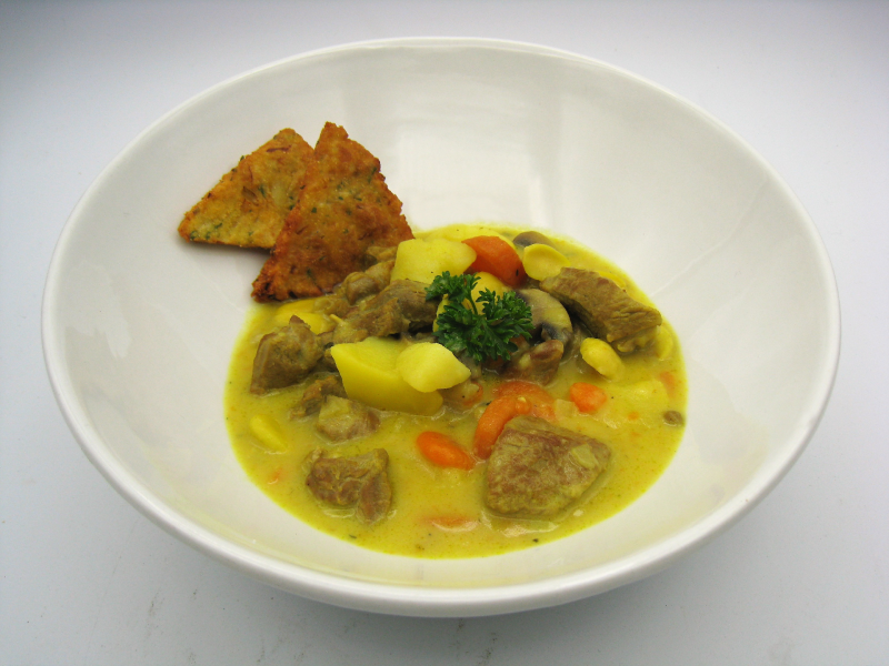 Cuando la carne comience a estar tierna, pelar las patatas, cortarlas en cachelos de tamaño medio y agregarlos al guiso. Verter entonces el vaso de nata y un poco de cúrcuma. Probar de sal, remover de forma suave y dejar cocinar, unos minutos, para que la patata se ponga tierna y la salsa vaya espesando.