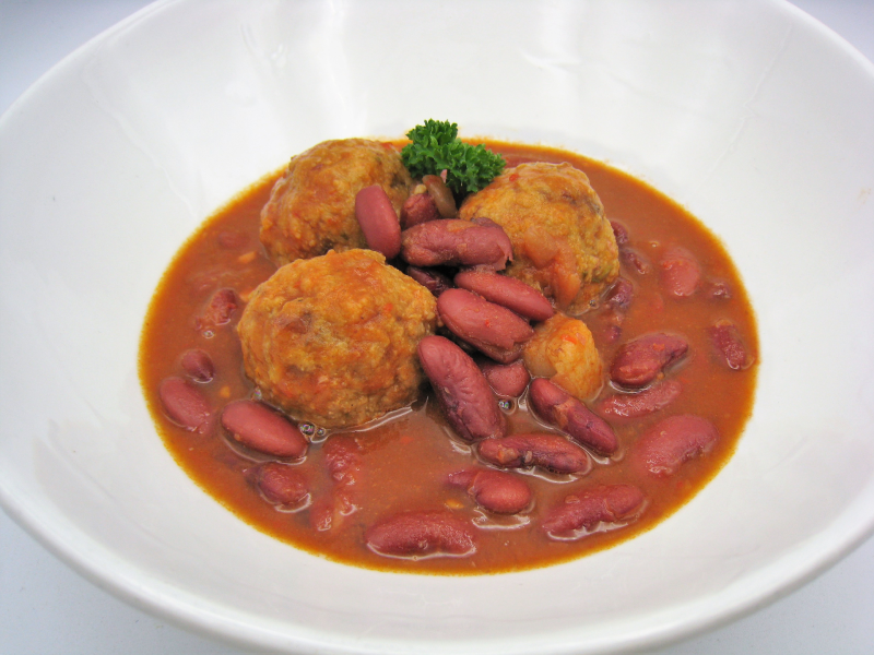 Hacer entonces albóndigas con la masa de carne e introducirlas en el guiso. Dejar cocinar, unos 15 minutos a fuego lento, hasta que las alubias estén tiernas y las albóndigas bien cocinadas.