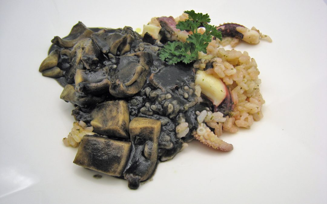 SUGERENCIA DE PRESENTACIÓN: Presentar porciones de choco en su tinta con un poco de arroz de guarnición