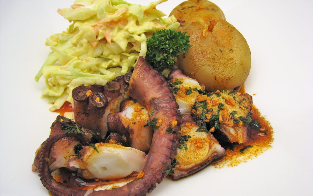 SUGERENCIA DE PRESENTACIÓN: Cortar el pulpo en pequeñas porciones y disponerlo en un plato aliñado con la vinagreta de pimentón y acompañado con un poco de ensalada de col.