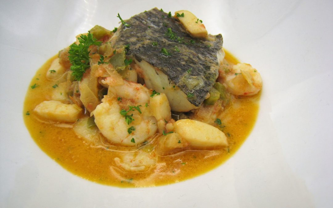 Verter entonces 1 vaso de caldo de pescado, 1/2 vaso de nata y 1 cucharada de mostaza. Cuando comience a hervir, introducir en la salsa las porciones de corvina y los cuerpos de las gambas. Dejar cocinar unos minutos a fuego medio-alto.
