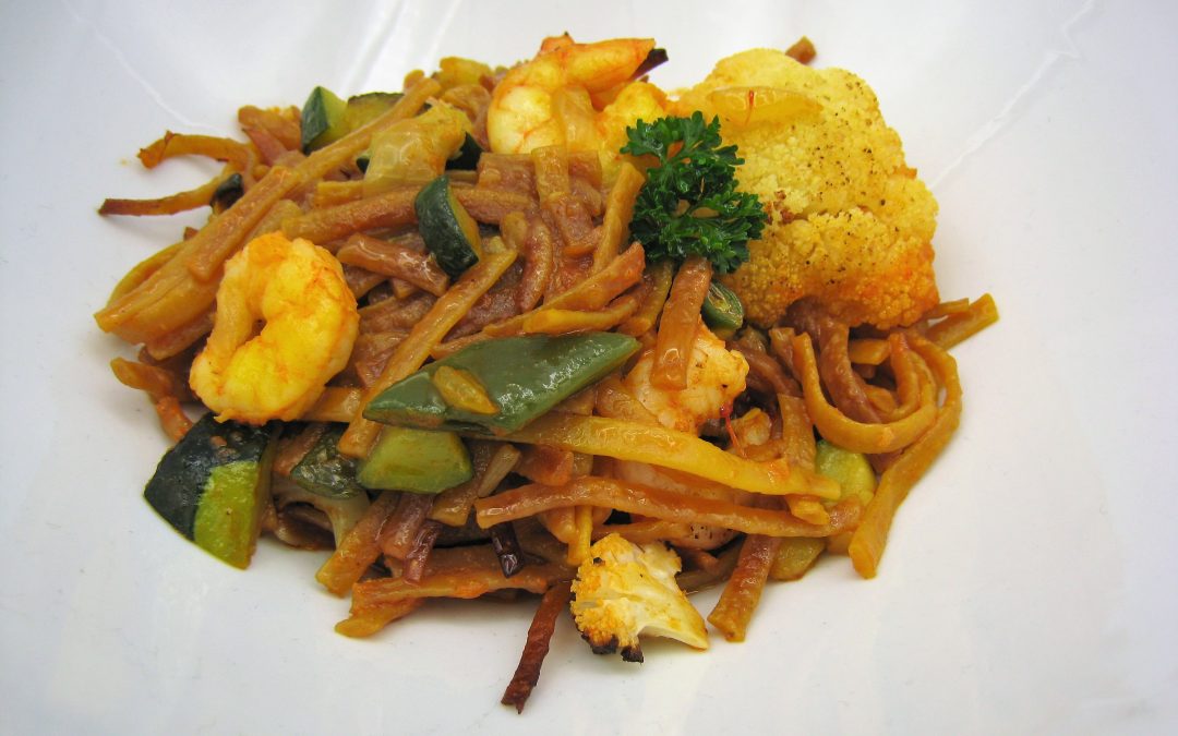 Cubrir con 2 vasos de agua, probar de sal, incorporar los cuerpos de las gambas y repartir por encima pequeñas porciones de coliflor. Llevar al horno, precalentado a 230ºC., resistencia arriba y abajo, y dejar cocinar durante 10 minutos.