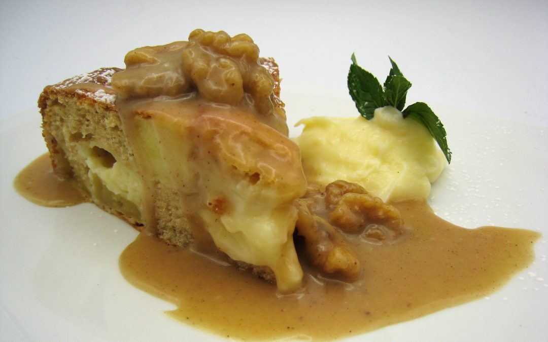 SUGERENCIA DE PRESENTACIÓN. Servir una porción de tarta, tibia o fría, acompañada de salsa de nueces, azúcar glasé y una hoja de menta para decorar.
