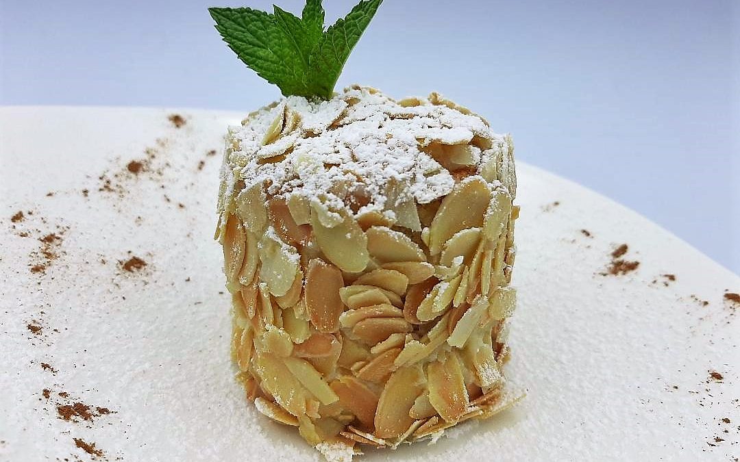 Empaparlos con el almíbar y montar uno sobre otro disponiendo un poco de crema de mantequilla en medio. Terminar de cubrir el exterior con más crema y rebozar con las láminas de almendras tostadas.