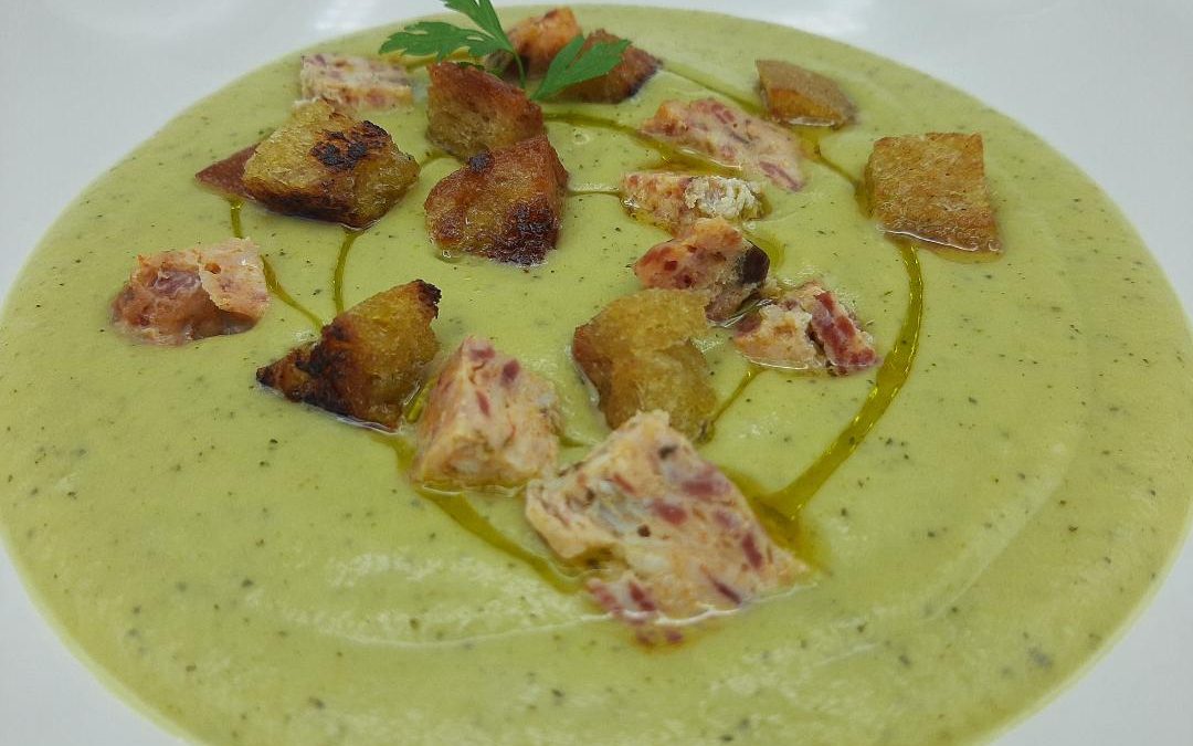 SUGERENCIA DE PRESENTACIÓN: Cuando la crema esté fría, añadir la pulpa de 1 aguacate maduro y 1 yogur tipo griego. Triturar todo bien. Servir la crema fría con los picatostes crujientes y algunas porciones de fiambre de pollo. Terminar con un chorrito de virgen extra por encima.