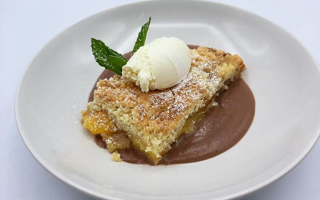 Disponer encima el crumble reservado, cubriendo toda la superficie, y hornear a 175ºC., entre 25 y 30 minutos; hasta que se dore.