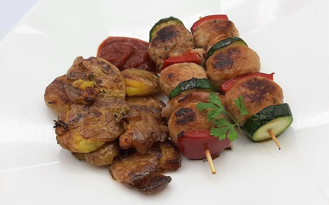 Finalmente, hacer brochetas intercalando albóndigas de cerdo con tiras de calabacín, de bacon y porciones de pimiento rojo y cocinarlas bien, en una sartén o plancha con un poco de aceite.
