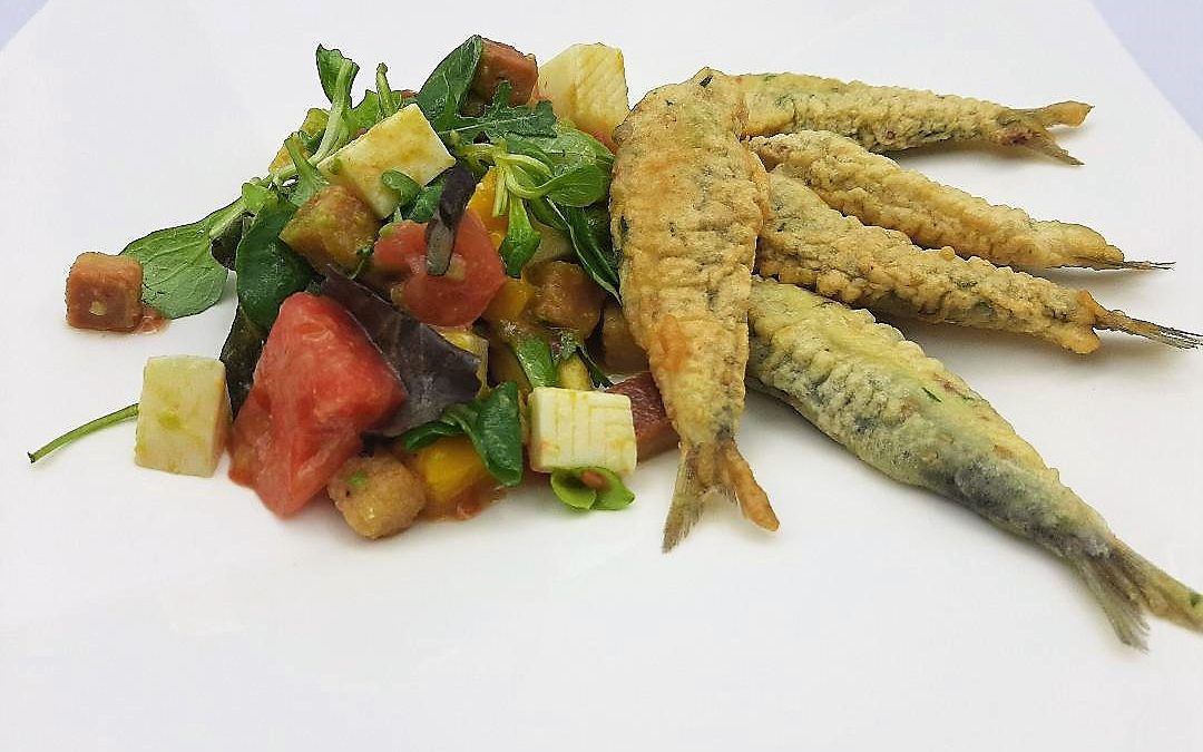 SUGERENCIA DE PRESENTACIÓN :Justo antes de servir, sacar la ensalada del frío, añadir la lechuga fresca y remover bien. Servir las sardinas fritas con la ensalada, pero sin estar en contacto. Pues la humedad de la ensalada quitaría crujiente a nuestras sardinas.