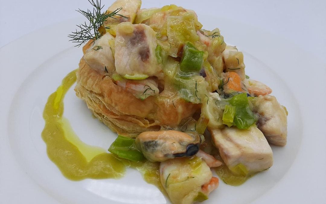 Incorporar el pez espada cortado en pequeñas porciones y las gambas. Mantener al fuego unos instantes y añadir 2 cucharadas colmadas de harina. Remover para que se cocine y verter, poco a poco, el caldo de los mejillones hasta obtener una masa cremosa.