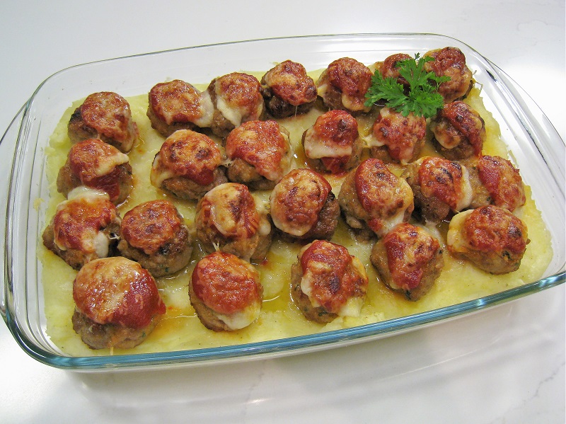 Escurrir las patatas cocidas y pasarlas por el pasapuré. Salpimentar y añadir el jugo de las albondiguitas y el aceite aromatizado donde las hemos dorado. Mezclar, extender en una fuente de horno y repartir las albondiguitas.