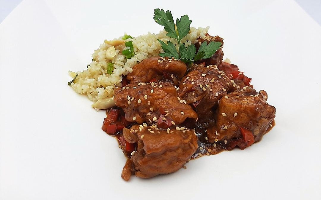 SUGERENCIA DE EMPLATADO: Como guarnición sencilla, dorar 3 dientes de ajo en una sartén con aceite de oliva. Cuando empiecen a coger color añadir los tallos verdes de las cebolletas, algunas cacahuetes tostados y el arroz cocido. Salpimentar y freír el arroz durante un par de minutos. Presentar el solomillo a la naranja espolvoreado con ajonjolí o sésamo y acompañar con unas cucharadas de arroz salteado.