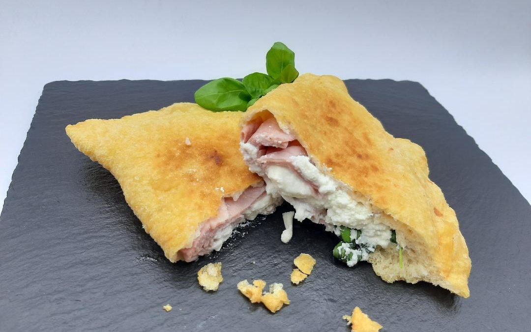 Estirar entonces con las manos y ayudándonos de harina; no debiendo quedar muy gruesa. Disponer encima lonchas de jamón, el queso ricota, la mozzarella, pimienta y unas hojas de albahaca fresca. Cerrar como si fuera una empanadilla y sellar bien los bordes por ambos lados.