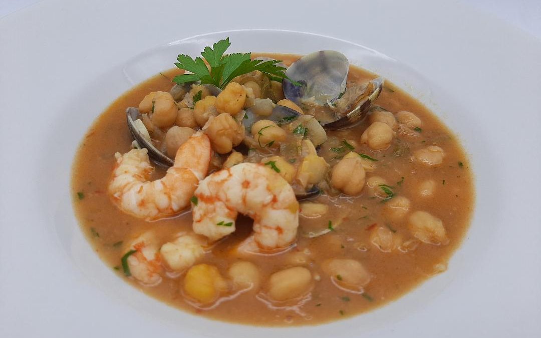 Por otro lado, dorar 3 dientes de ajo fileteados con un poco de virgen extra. Agregar 1 cucharada colmada de harina, cocinar brevemente y verter la manzanilla. Dejar hervir un poco e incorporar caldo del guiso. Mezclar bien y verter sobre los garbanzos.