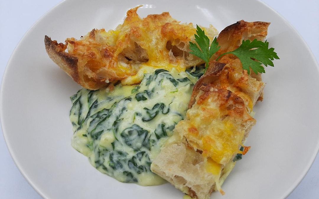 Cortar los molletes en porciones y extenderlas por encima de la espinacas, colocándolas un poco montadas unas sobre otras.