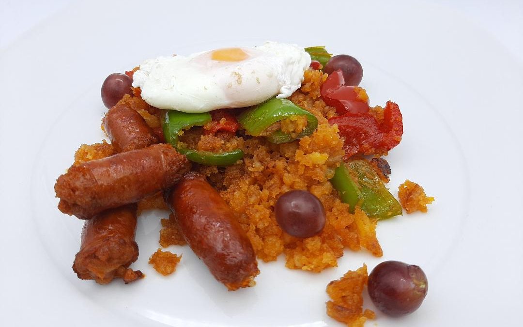 Cuando tengamos la textura de migas deseadas, devolver los pimientos y los ajos. Mezclar y apagar.