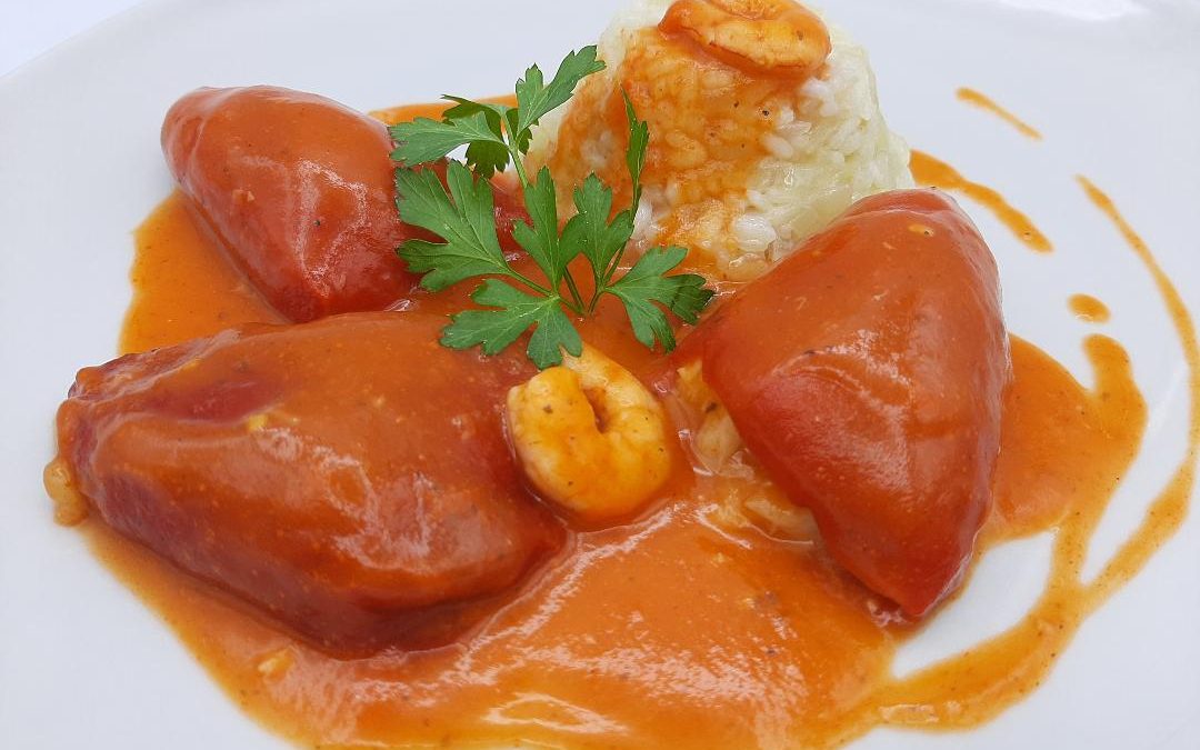Rellenar los pimientos del piquillo con la brandada y colocarlos en la salsa para que se calienten.