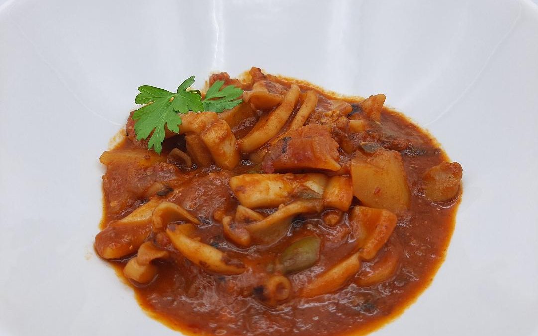 Cocinar, a fuego medio-alto, hasta que se haya evaporado casi todo el líquido, la salsa haya reducido y espesado y los calamares estén bien tiernos.