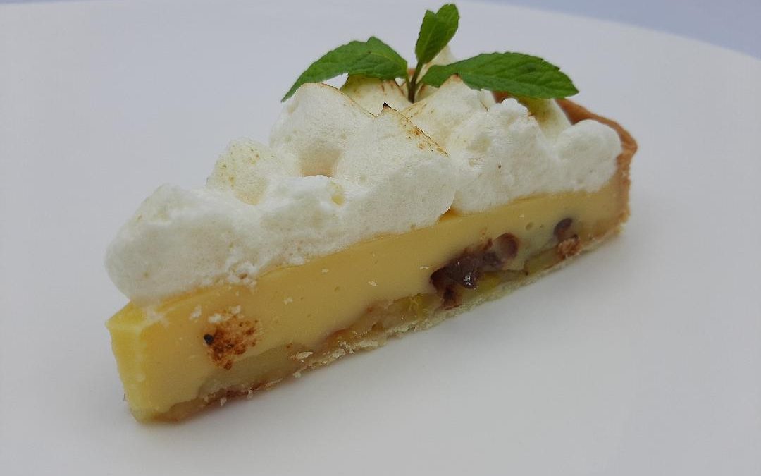 Para la base de la tarta, derretir la mantequilla en una sartén y agregar los plátanos cortados en finas rodajas y el azúcar. Cocinar hasta que los plátanos empiecen a coger color y verter sobre la base de masa quebrada. Repartir pepitas de chocolate por la superficie y cubrir con la crema de yemas. Llevar al frío unas horas.