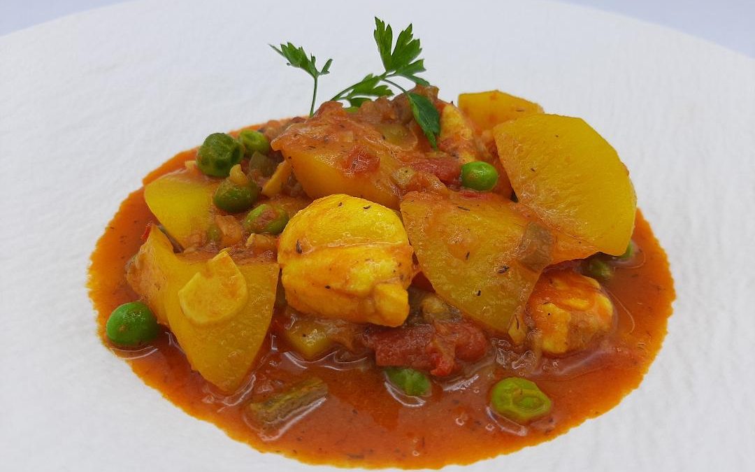 Solo nos resta cortar el rape en rodajas y, cuando la patata esté tierna, añadirlo junto con los guisantes frescos. Probar de sal y dejar cocinar, unos 5 minutos, a fuego medio.