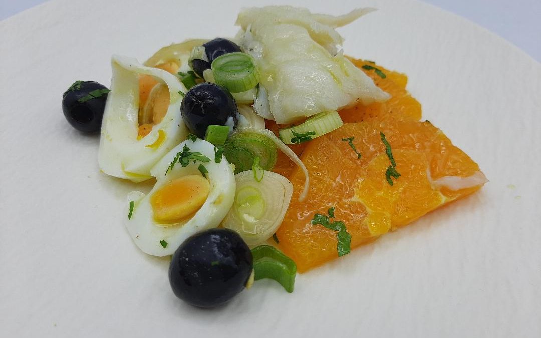 Mientras tanto, iremos disponiendo en una fuente o ensaladera las naranjas peladas y cortadas en medias rodajas, las cebolletas troceadas, los huevos cocidos cortados en rodajas y el bacalao desmenuzado.