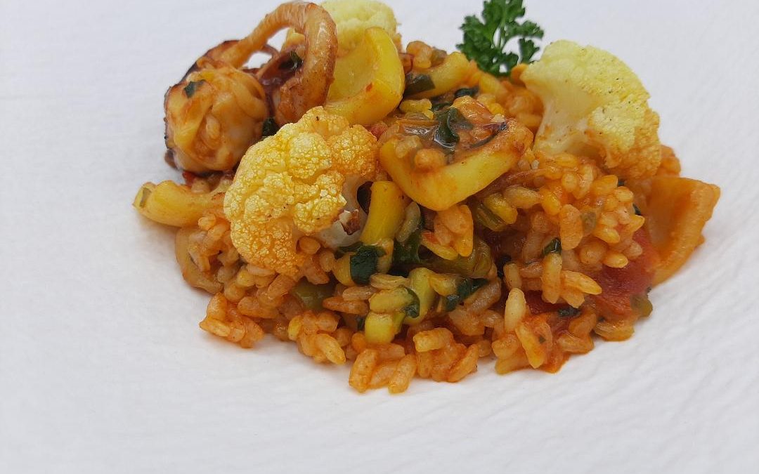 Sacar pequeñas porciones de coliflor, disponerlas en un cuenco, salpimentar y regar con unas cucharadas de virgen extra. Remover bien y colocar sobre el arroz. Llevar al horno, precalentado a 240º C., durante 12 minutos. (Total tiempo de cocción del arroz, 15 minutos)