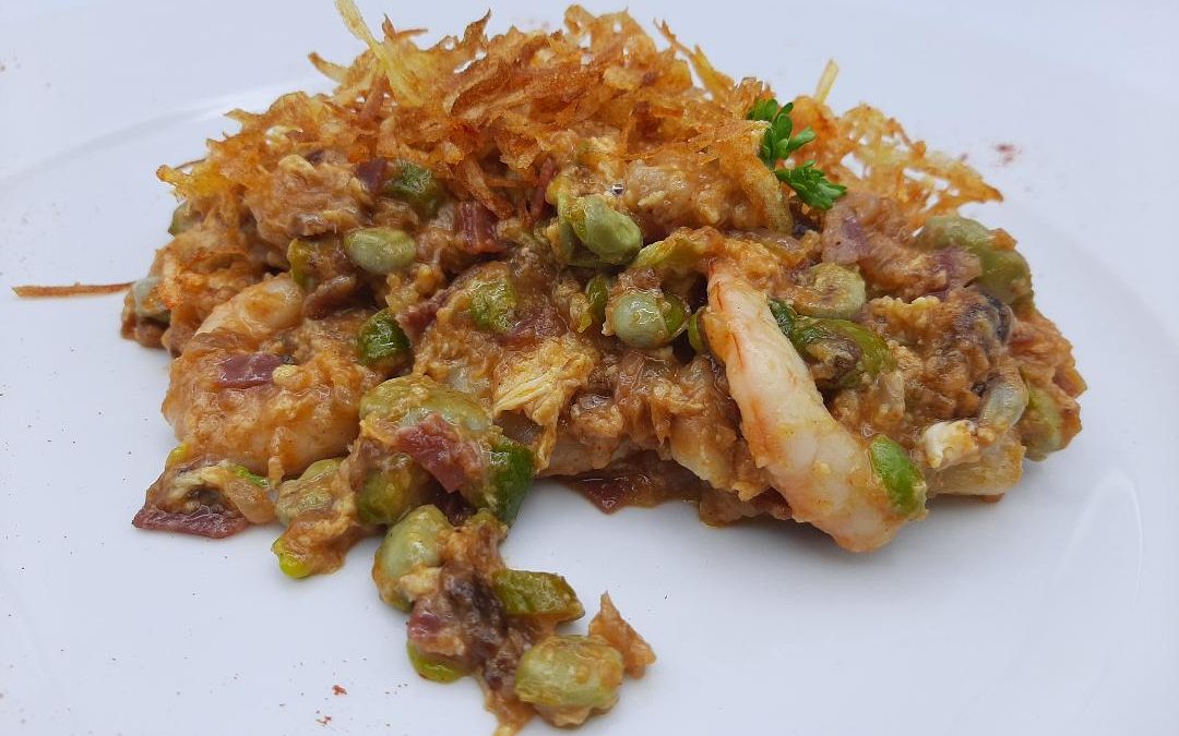 Para terminar nuestro revuelto, batir los huevos con un chorrito de nata, sal y pimienta. Verter sobre las verduras e incorporar el jamón picado y las gambas peladas. Mezclar bien y llevar al fuego, sin parar de mover hasta que tengamos el revuelto cuajado en el punto deseado.