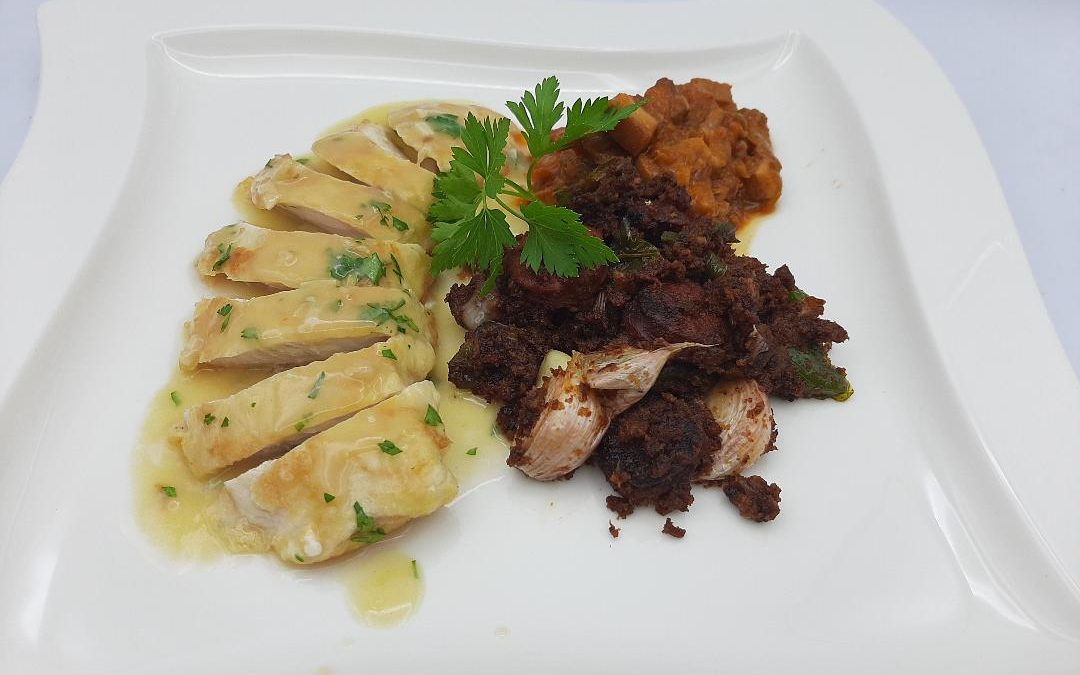 Incorporar caldo de pollo hasta tener una textura de crema ligera. Probar de sal e introducir los filetes de pollo para que se terminen de cocinar en la salsa.