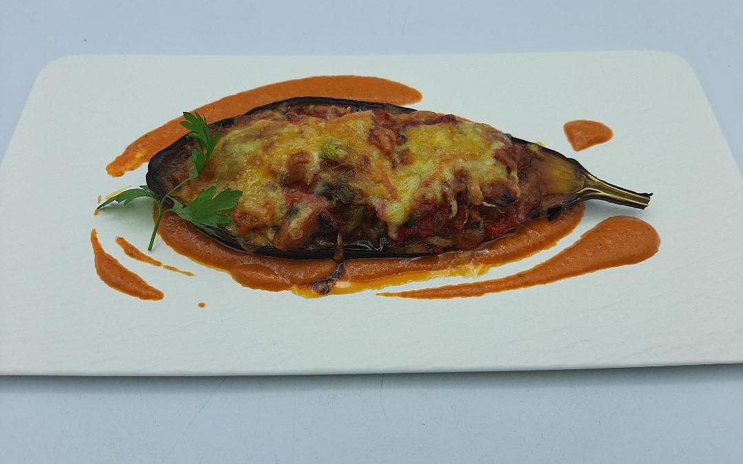 Cortar las berenjenas longitudinalmente a la mitad y vaciar parte de la pulpa con ayuda de un cuchillo.