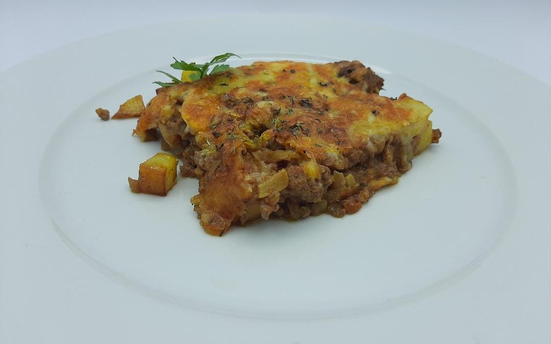 Repartir la carne picada por encima de las patatas, espolvorear con queso rallado, un poco de orégano y llevar al horno, precalentado a 200ºC, hasta que gratine el queso.
