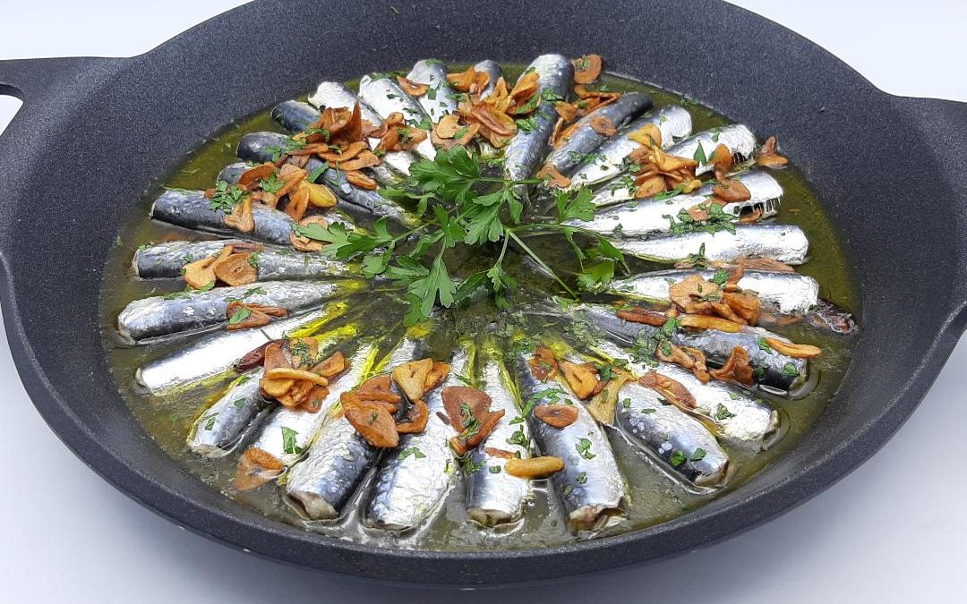En la misma cacerola donde hemos dorado los ajos, repartir las sardinas y sazonar.