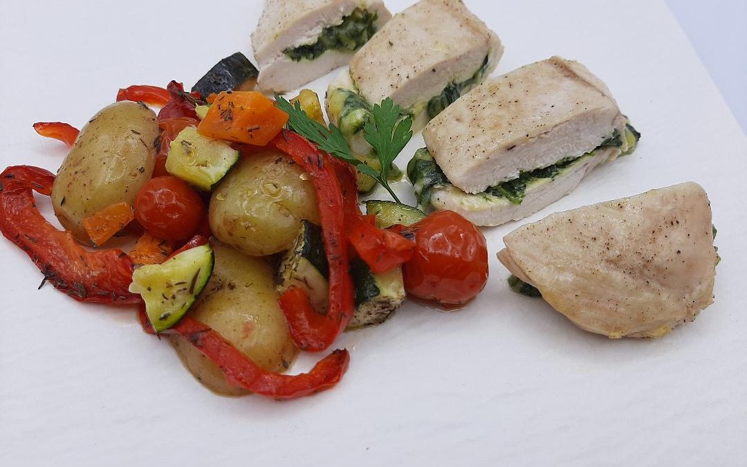 Rellenarlas, cerrarlas y cocinarlas o en una sartén con un poco de aceite o bien colocarlas en una fuente de horno, salpimentar, regar con un poco de virgen extra y llevarlas al horno, a la misma temperatura que las verduras, durante 15 minutos aproximadamente.