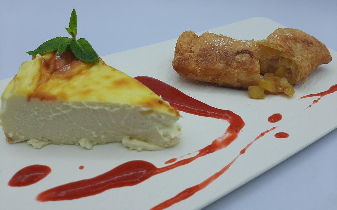 Para acompañar la tarta, haremos una sencilla y rápida salsa de fresas. Para ello retirar los tallos y lavar las fresas. Disponer en una jarra con 1 cucharada de vinagre y 1 cucharada de azúcar moreno. Triturar bien hasta tener una textura cremosa y reservar al frío.