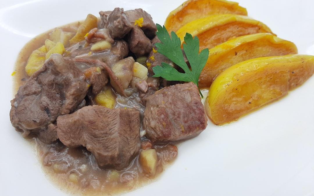 (Servir jarrete con salsa, algunas porciones de manzana salteada y terminar (truco) rallando un poco de naranja por encima)