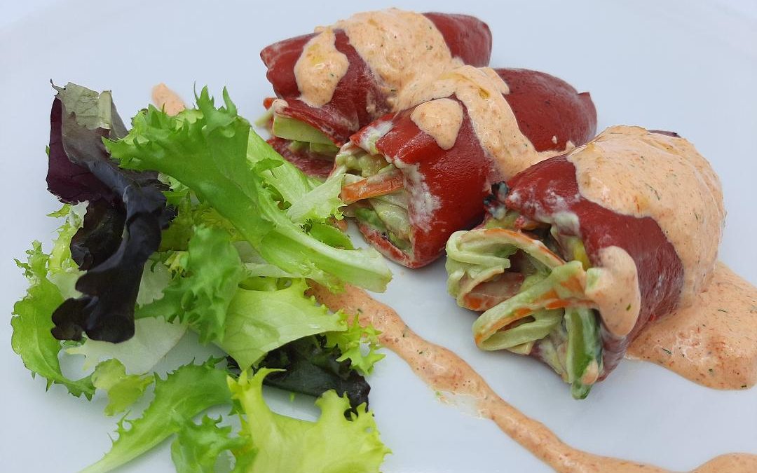 Para la salsa, disponer 2 piquillos en una jarra y añadir unas 4 cucharadas de mayonesa, algunas avellanas, chile al gusto, una pizca de eneldo, un poco de ralladura de naranja y 2 cucharadas de de jugo de esta.
