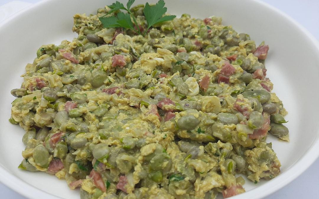 Añadir entonces el jamón y perejil fresco, picados y los huevos batidos con un poco de leche. Remover y cocinar al gusto.