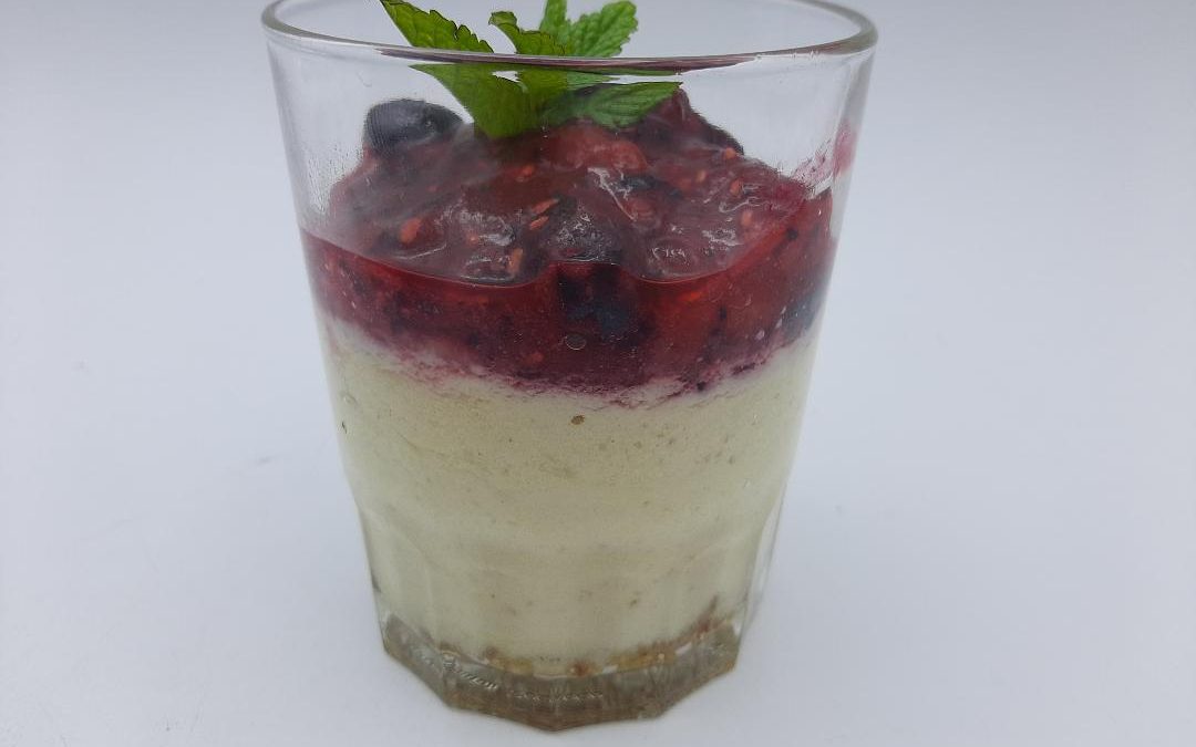 (Presentar los vasos de tarta de queso con la cobertura de frutos rojos por encima. Terminar decorando los dos postres con algunas hojas de hierbabuena)