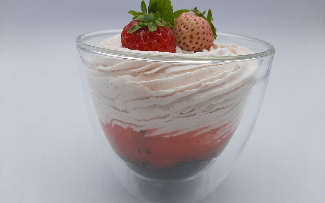 Para la base, picar las galletas y disponer en vasos. Agregar sobre estos la salsa de fresas y encima, con ayuda de una manga pastelera, la mousse de fresas.