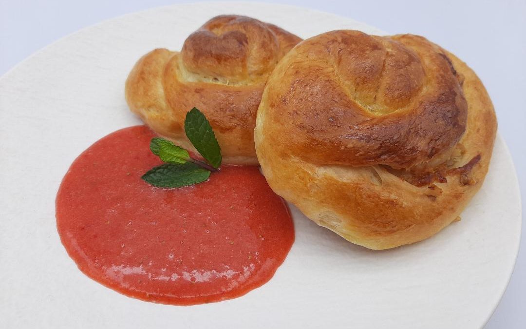 Por último, para la salsa, batir las fresas limpias con las cucharadas de miel.(Sacar del horno las caracolas doradas y cubrir con un paño entre 10 y 15 minutos para que se mantengan bien tiernas)