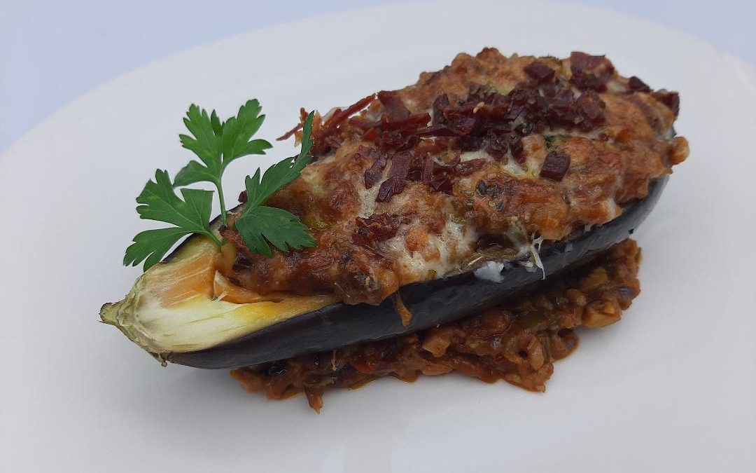 Disponer un poco de queso rallado en la base de las berenjenas y cubrir con el relleno que hemos preparado. Terminar por encima con un poco más de queso rallado, jamón picado y orégano. Llevar al horno hasta que gratine.