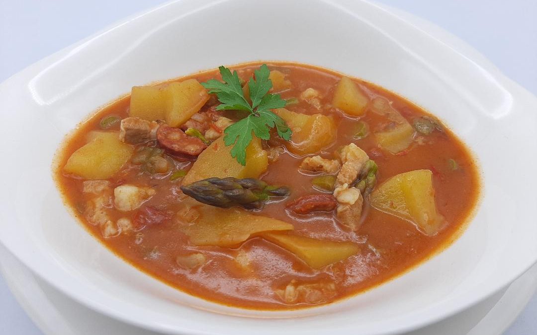 Pelar las patatas y desgajar en porciones de buen tamaño. Añadir a nuestra receta, cubrir con agua, ajustar de sal y dejar hervir unos minutos.