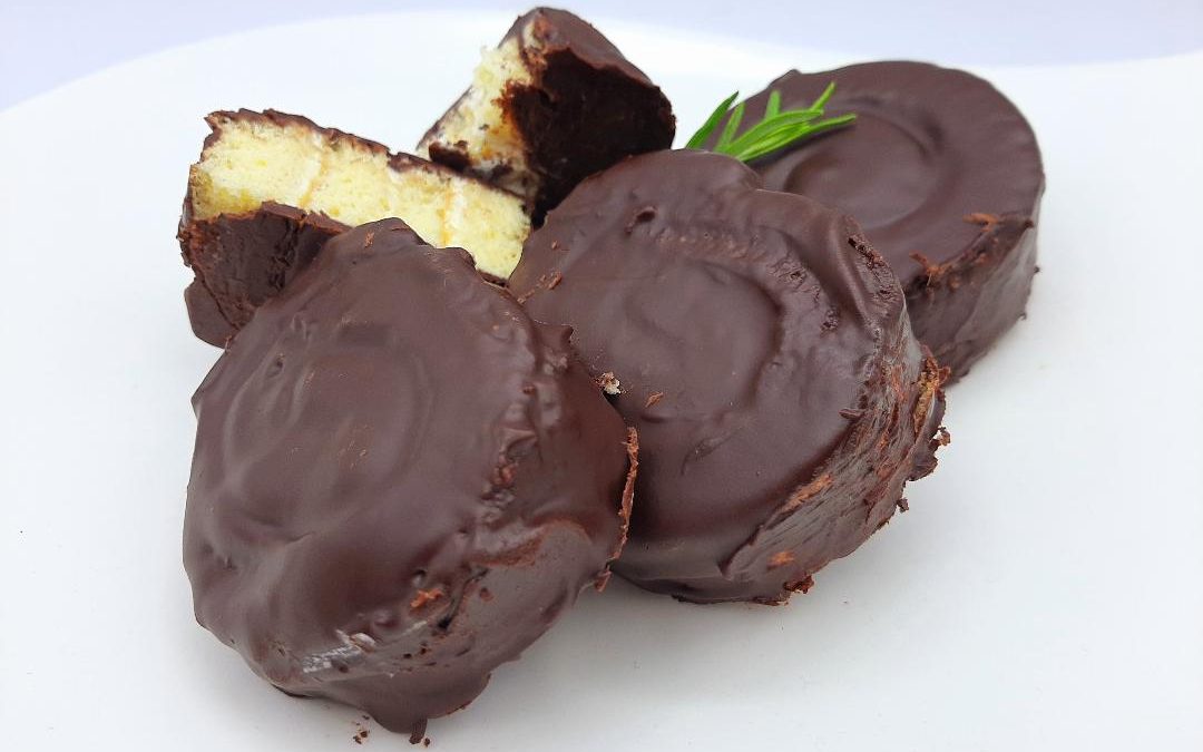 Coger con las manos y bañar en el chocolate uno de los lados de cada porción. Disponer con la parte que hemos bañado hacia arriba en un plato y llevar al frío. Una vez haya solidificado el chocolate, colocarlos sobre una rejilla (con un plato o papel de horno debajo) y verter el resto de chocolate por encima para terminar de bañarlos. Guardar al frío hasta que el chocolate se vuelva sólido.