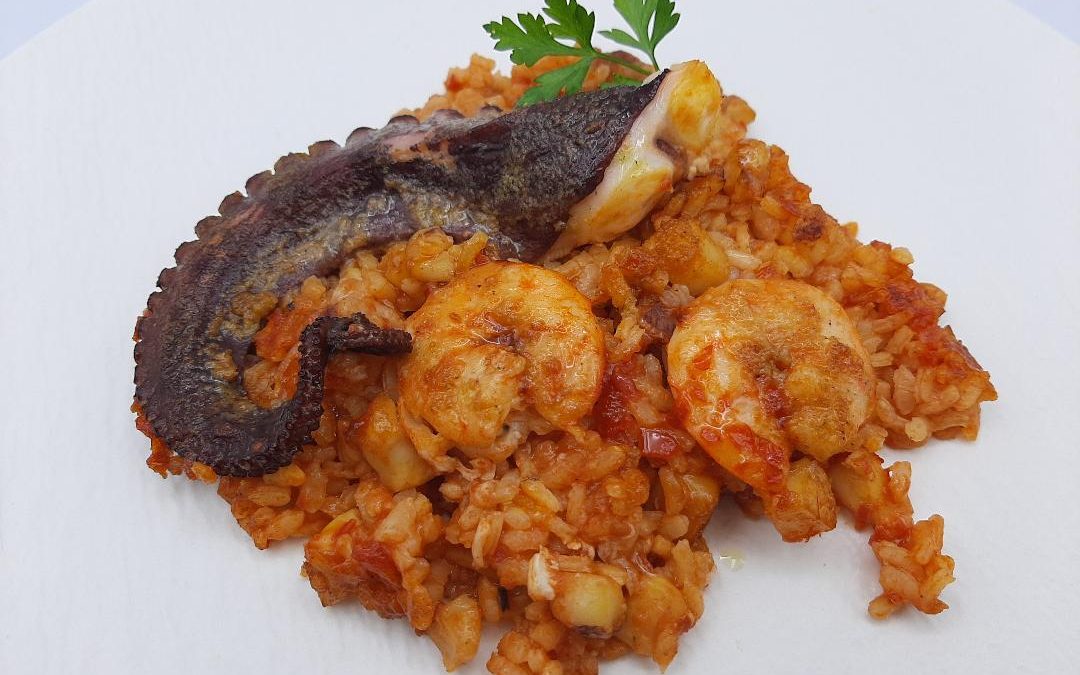 Distribuir sobre el arroz los cuerpos de los langostinos y 3 o 4 patas de pulpo. Llevar al horno, a máxima potencia, hasta que el arroz cumpla 15 minutos de cocción en total.