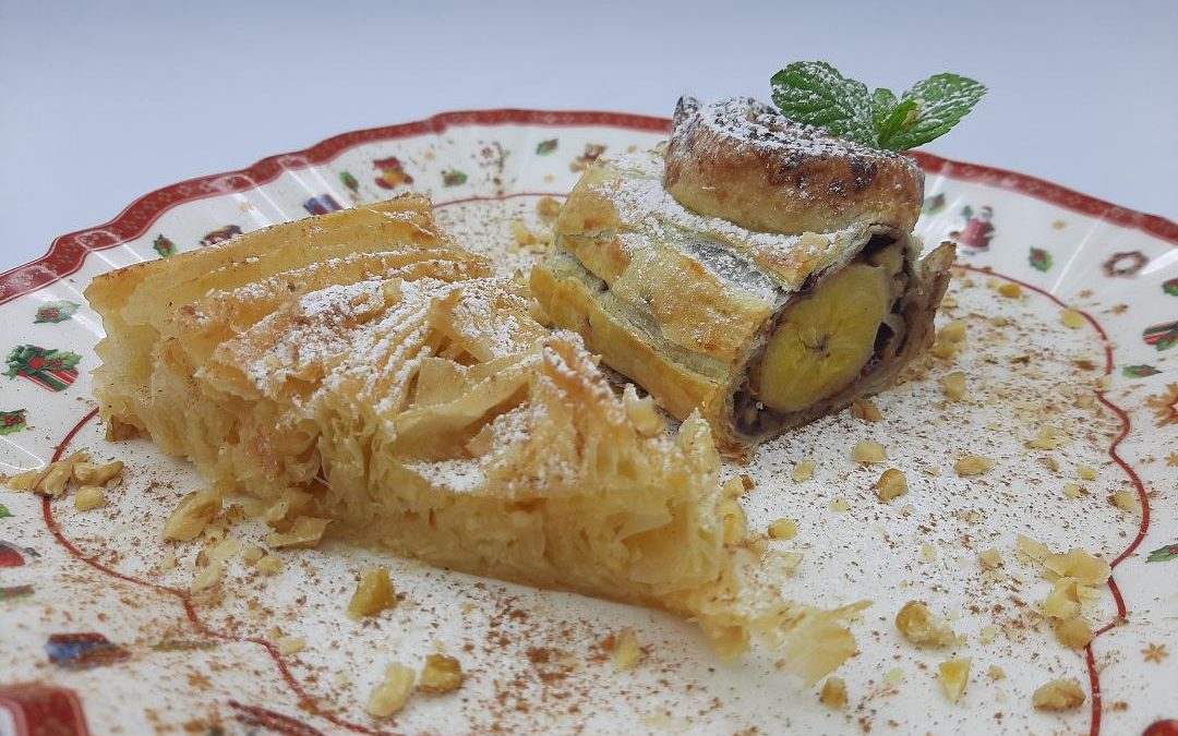 Enrollar cada rodaja de plátano reservada con 2 tiras pequeñas de hojaldre y colocar sobre el tronco. Enrollar las 2 tiras restantes sobre sí mismas y colocar también en el tronco junto con las hojas que hemos hecho.