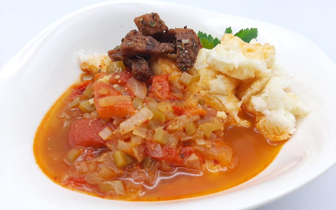 Verter sobre el caldo e incorporar los pimientos asados cortados en tiras.